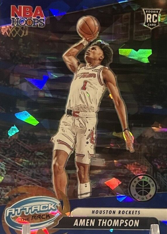 The Amen Thompson 2023 Hoops Premium Stock #9 Attack the Rack - Blue Ice /99 Rookie card in Raw condition has not changed in price in the last 30 days and was last sold for $18.50 .