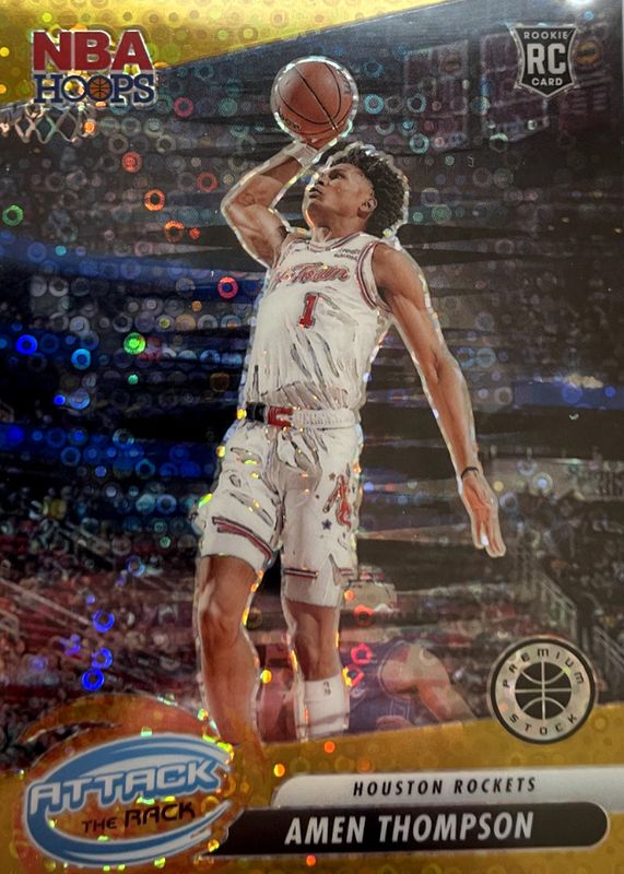 The Amen Thompson 2023 Hoops Premium Stock #9 Attack the Rack - Gold Disco /10 Rookie card in Raw condition has not changed in price in the last 30 days and was last sold for $127.50 .