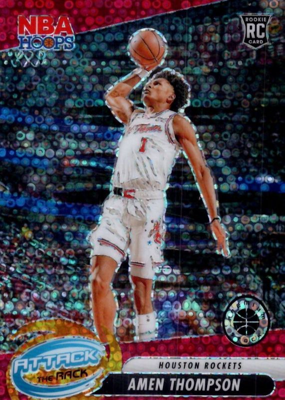 The Amen Thompson 2023 Hoops Premium Stock #9 Attack the Rack - Red Disco /99 Rookie card in Raw condition has not changed in price in the last 30 days and was last sold for $17.00 .