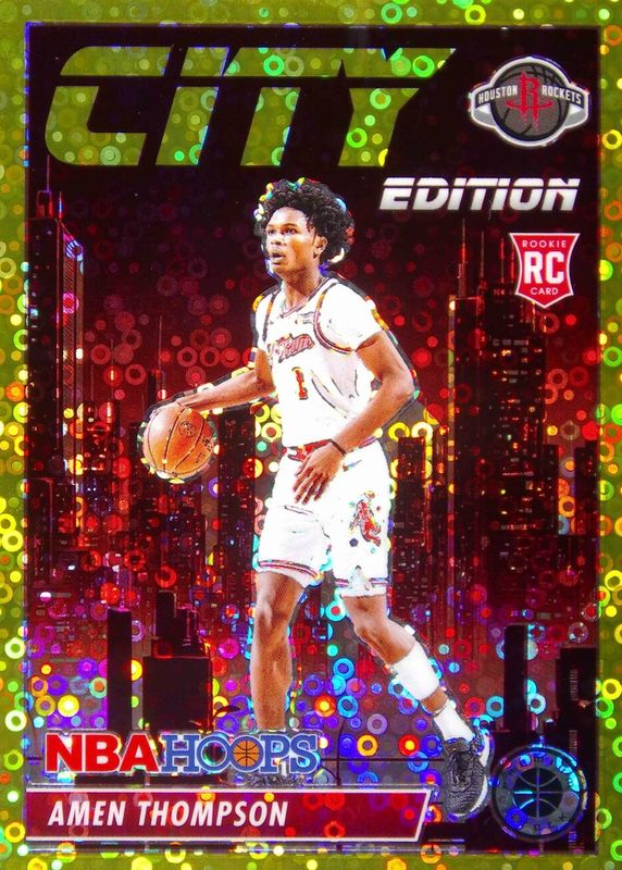 The Amen Thompson 2023 Hoops Premium Stock #14 City Edition - Gold Disco /10 Rookie card in Raw condition has not changed in price in the last 30 days and was last sold for $125.00 .