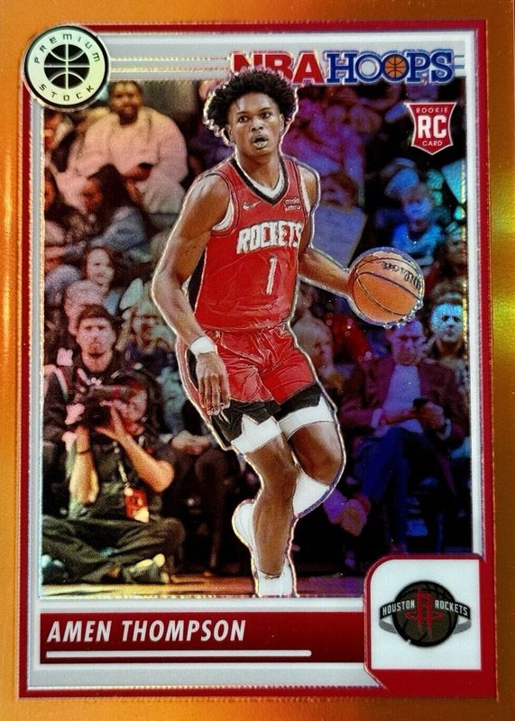 The Amen Thompson 2023 Hoops Premium Stock #86 Orange /299 Rookie card in Raw condition has not changed in price in the last 30 days and was last sold for $16.00 .