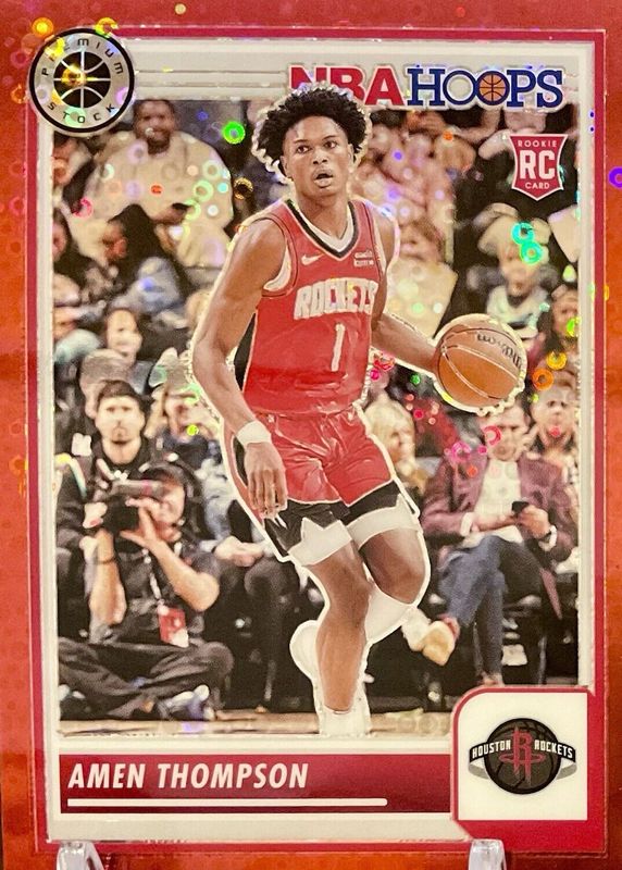 The Amen Thompson 2023 Hoops Premium Stock #86 Red Disco /149 Rookie card in Raw condition has not changed in price in the last 30 days and was last sold for $25.00 .