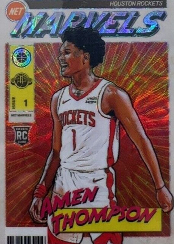 The Amen Thompson 2023 Hoops Premium Stock #24 Retro Net Marvels /(SSP) Rookie card in Raw condition has moved down -$43.00 (-30.2%) in the last 30 days and was last sold for $99.50 .