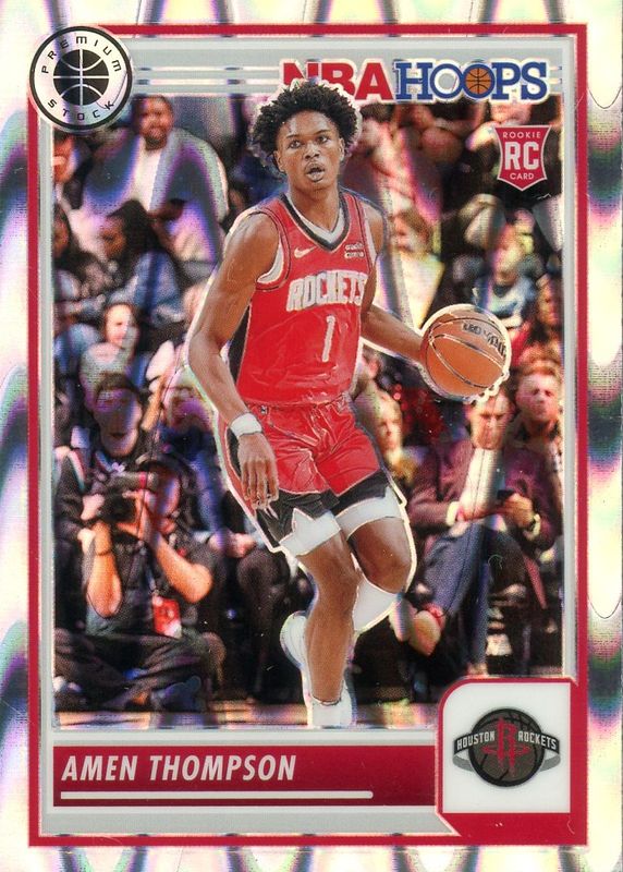 The Amen Thompson 2023 Hoops Premium Stock #86 Seismic Rookie card in Raw condition has moved up $2.01 (+203%) in the last 30 days and was last sold for $3.00 .