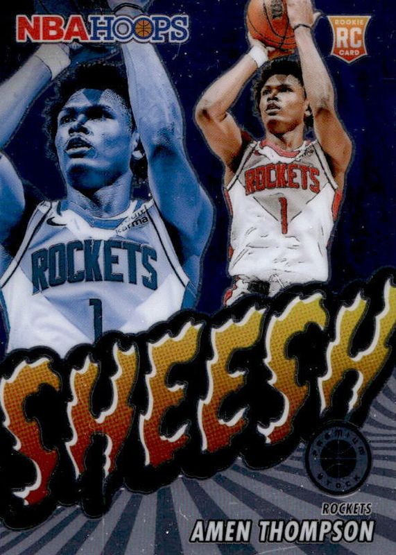 The Amen Thompson 2023 Hoops Premium Stock #4 Sheesh Rookie card in Raw condition has moved down -$0.50 (-31.8%) in the last 30 days and was last sold for $1.07 .