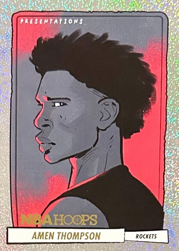 The Amen Thompson 2023 Hoops #18 Presentations /(SSP) Rookie card in Raw condition has moved up $8.00 (+11.9%) in the last 30 days and was last sold for $75.00 .