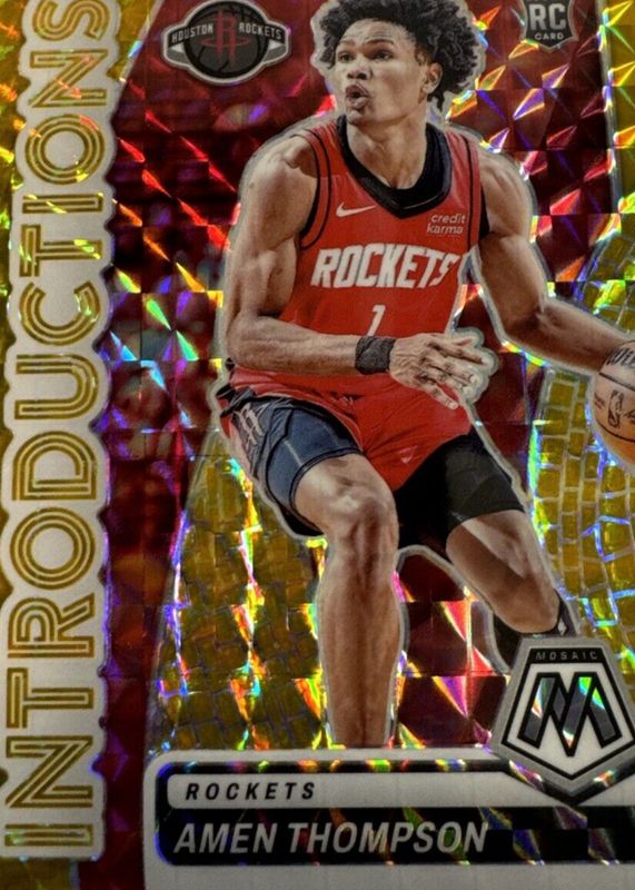 The Amen Thompson 2023 Mosaic #3 Introductions - Gold /10 Rookie card in Raw condition has not changed in price in the last 30 days and was last sold for $127.50 .