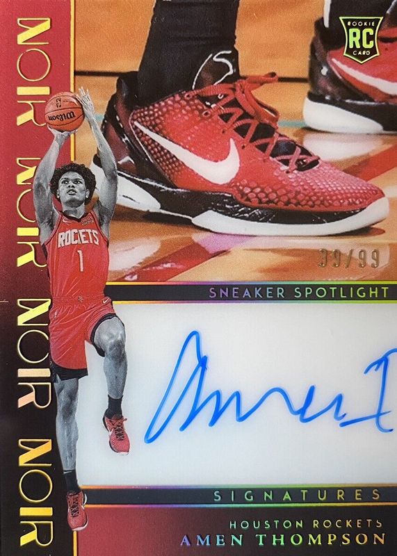 The Amen Thompson 2023 Noir #SSS-AMN Sneaker Spotlight Signatures (/99) Rookie card in Raw condition has not changed in price in the last 30 days and was last sold for $1,730.00 .