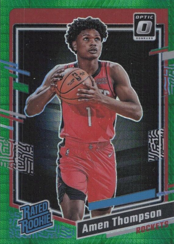 The Amen Thompson 2023 Optic #229 Hyper Green Rookie card in Raw condition has moved down -$5.76 (-85.3%) in the last 30 days and was last sold for $0.99 .