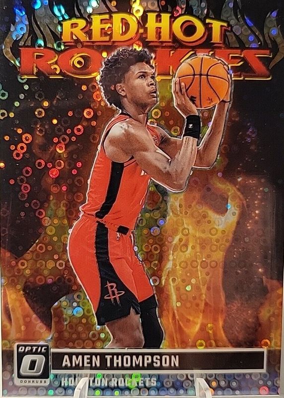 The Amen Thompson 2023 Optic #14 Red Hot Rookies - Fast Break card in Raw condition has not changed in price in the last 30 days and was last sold for $9.99 .