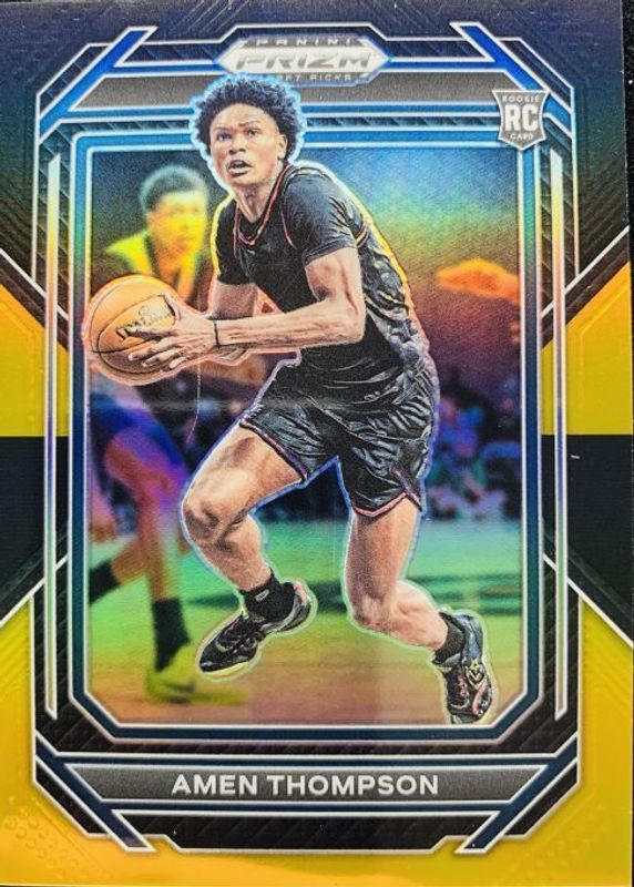The Amen Thompson 2023 Prizm Draft Picks #4 Black Gold /5 Rookie card in Raw condition has not changed in price in the last 30 days and was last sold for $107.50 .