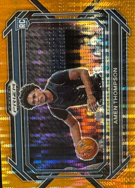 The Amen Thompson 2023 Prizm Draft Picks #4 Variation - Orange Pulsar /49 Rookie card in Raw condition has not changed in price in the last 30 days and was last sold for $8.00 .