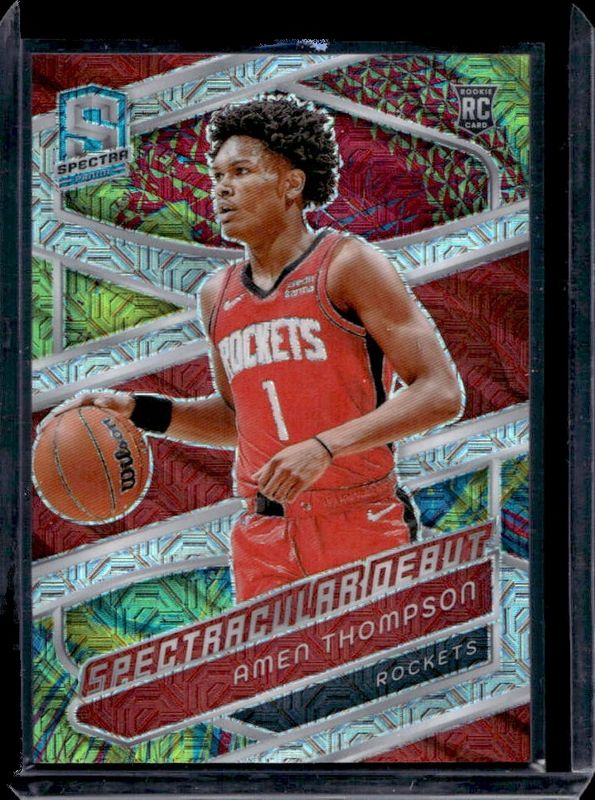 The Amen Thompson 2023 Spectra #185 Meta /25 Rookie card is 1 of 125 Amen Thompson's card variations in the 2023 Spectra set being tracked by Sports Card Investor, including #150 Base, #185 Base, #225 Base, #185 Spectacular Debut, and #185 International.