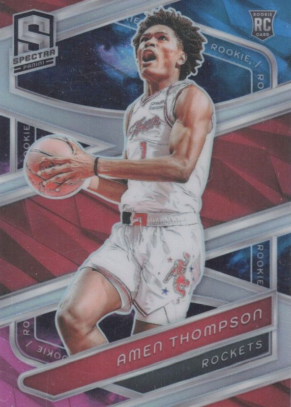 The Amen Thompson 2023 Spectra #150 Nebula /1 Rookie card in Raw condition has not changed in price in the last 30 days and was last sold for $1,500.00 .