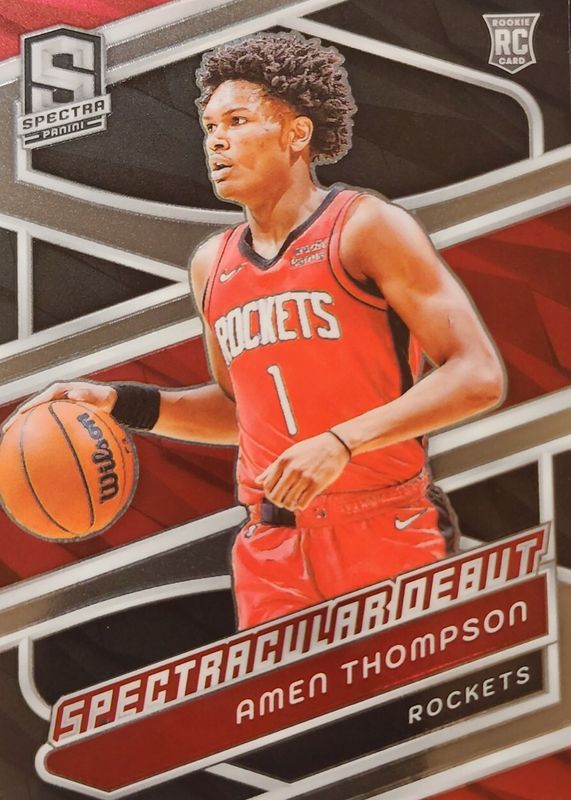 The Amen Thompson 2023 Spectra #185 Spectacular Debut Rookie card in Raw condition has not changed in price in the last 30 days and was last sold for $5.00 .