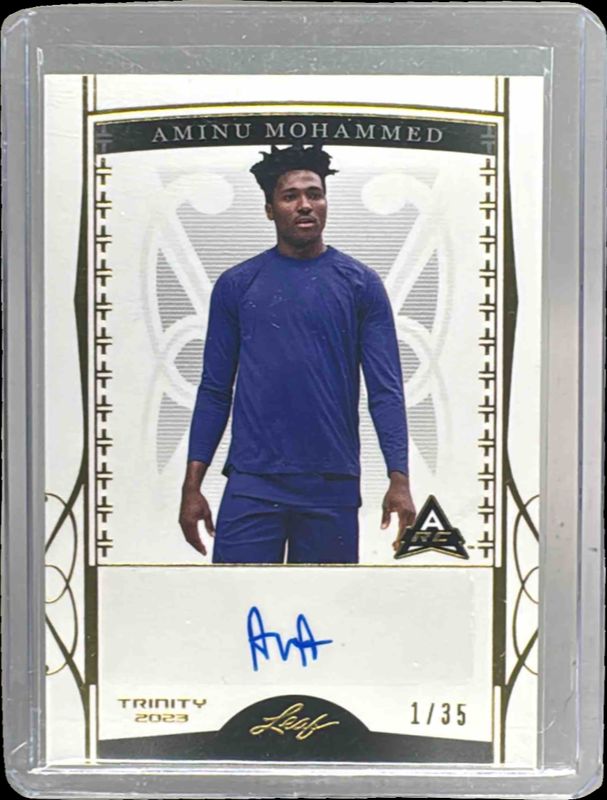 The Aminu Mohammed 2022 Leaf Trinity #BA-AM1 Gold /35 card is 1 of 34 Aminu Mohammed's card variations in the 2022 Leaf Trinity set being tracked by Sports Card Investor, including Base /49, Blue /30, Holo Platinum /25, Holo Green /20, and Holo Silver /15.