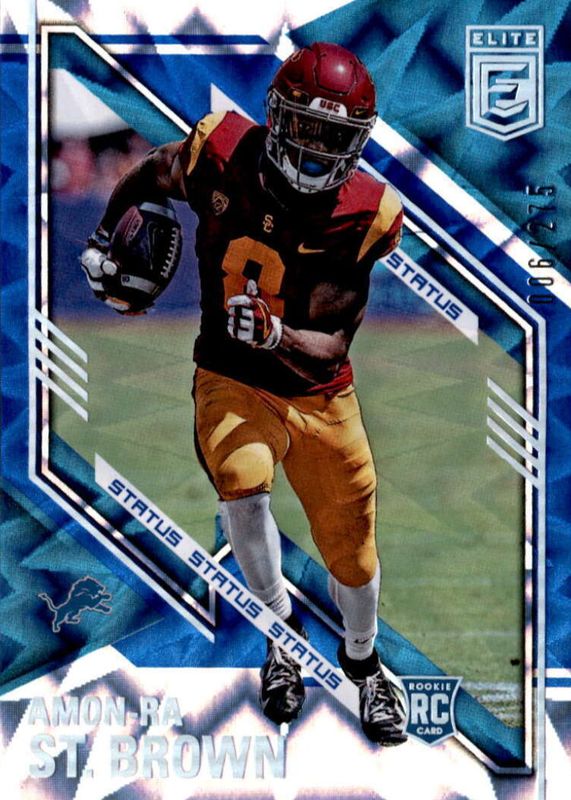 The Amon-Ra St. Brown 2021 Elite #126 Status Explosion /275 Rookie card in Raw condition has not changed in price in the last 30 days and was last sold for $4.24 .