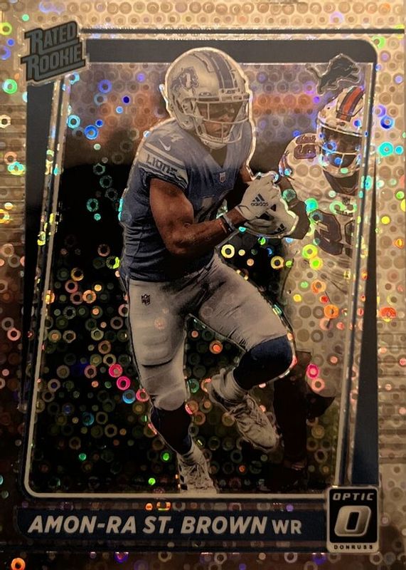 The Amon-Ra St. Brown 2021 Optic #228 Silver Circles /125 Rookie card in Raw condition has not changed in price in the last 30 days and was last sold for $38.77 .