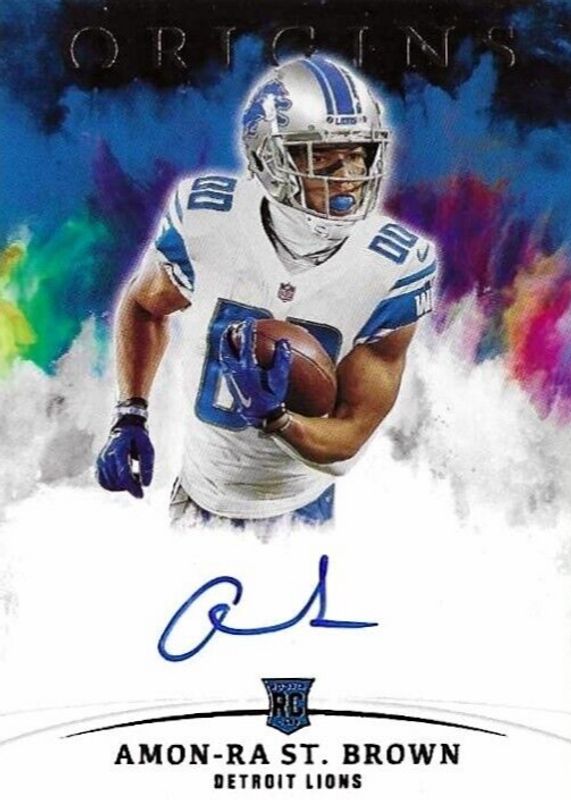The Amon-Ra St. Brown 2021 Origins #RA-ASB Rookie Autographs card in Raw condition has not changed in price in the last 30 days and was last sold for $112.50 .