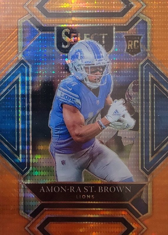 The Amon-Ra St. Brown 2021 Select #273 Club Level Neon Orange Pulsar /7 Rookie card in Raw condition has not changed in price in the last 30 days and was last sold for $200.00 .