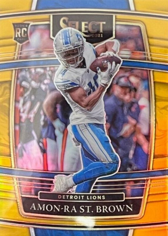 The Amon-Ra St. Brown 2021 Select #73 Concourse Gold /10 Rookie card in Raw condition has not changed in price in the last 30 days and was last sold for $256.00 .