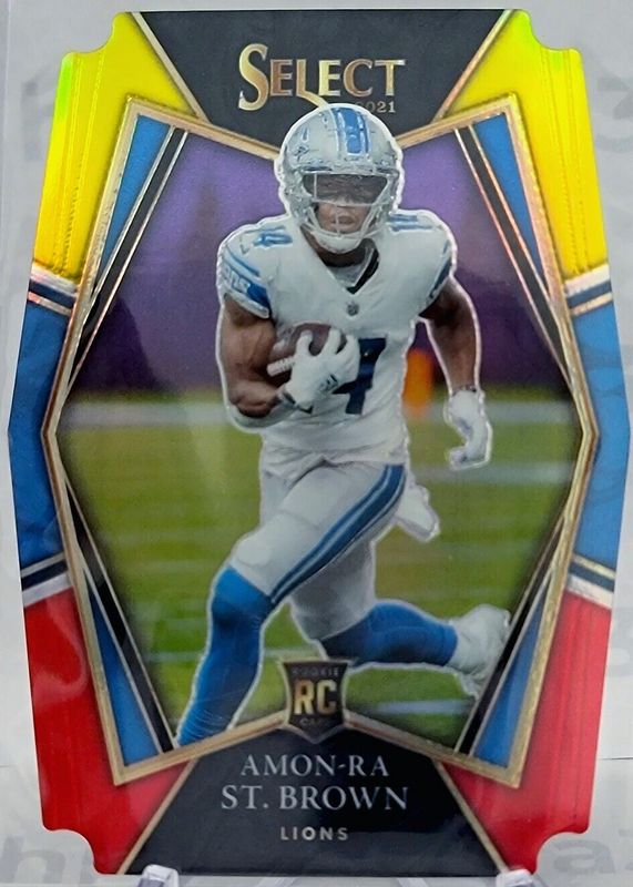 The Amon-Ra St. Brown 2021 Select #173 Premier Level Red & Yellow Die-Cut Rookie card in Raw condition has moved down -$1.99 (-26.5%) in the last 30 days and was last sold for $5.51 .