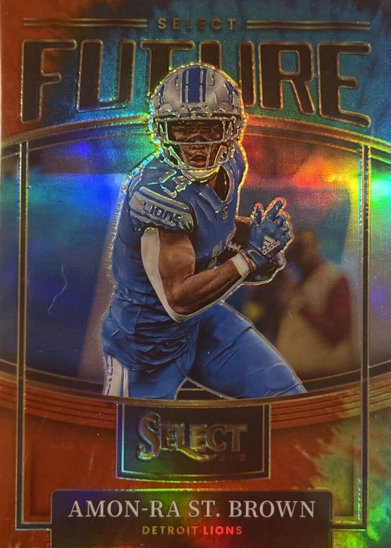 This card is 1 of 18 Amon-Ra St. Brown's card variations in the 2022 Select set being tracked by Sports Card Investor, including Phenomenon - Zebra /(SSP), Select Future - Zebra /(SSP), Turbocharged - Zebra /(SSP), Phenomenon - Tie-Dye /25, and Turbocharged - Tie-Dye /25.