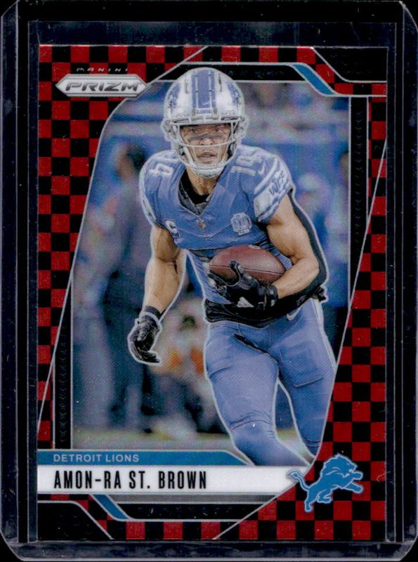 The Amon-Ra St. Brown 2024 Prizm #95 Black & Red Checker /(SSP) card is 1 of 85 Amon-Ra St. Brown's card variations in the 2024 Prizm set being tracked by Sports Card Investor, including Base, Choice Blue Yellow Green, Choice Silver, Disco, and Green.