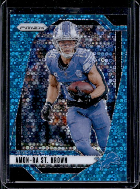 The Amon-Ra St. Brown 2024 Prizm #95 No Huddle Blue /99 card is 1 of 85 Amon-Ra St. Brown's card variations in the 2024 Prizm set being tracked by Sports Card Investor, including Base, Choice Blue Yellow Green, Choice Silver, Disco, and Green.