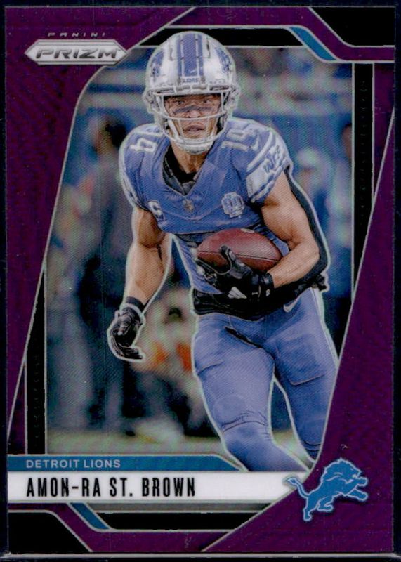 The Amon-Ra St. Brown 2024 Prizm #95 Purple /125 card is 1 of 85 Amon-Ra St. Brown's card variations in the 2024 Prizm set being tracked by Sports Card Investor, including Base, Choice Blue Yellow Green, Choice Silver, Disco, and Green.