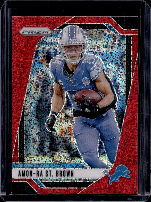 The Amon-Ra St. Brown 2024 Prizm #95 Red Sparkle /(SSP) card is 1 of 85 Amon-Ra St. Brown's card variations in the 2024 Prizm set being tracked by Sports Card Investor, including Base, Choice Blue Yellow Green, Choice Silver, Disco, and Green.