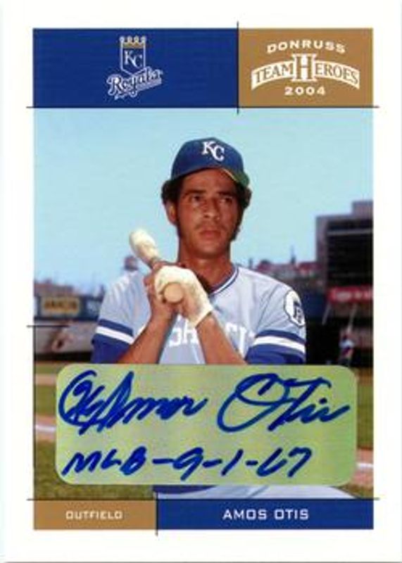 The Amos Otis 2004 Donruss Team Heroes #205 Autographs /10 card is 1 of 5 Amos Otis' card variations in the 2004 Donruss Team Heroes set being tracked by Sports Card Investor, including Base, Showdown - Bronze /150, Showdown - Silver /50, and Showdown - Gold /10.
