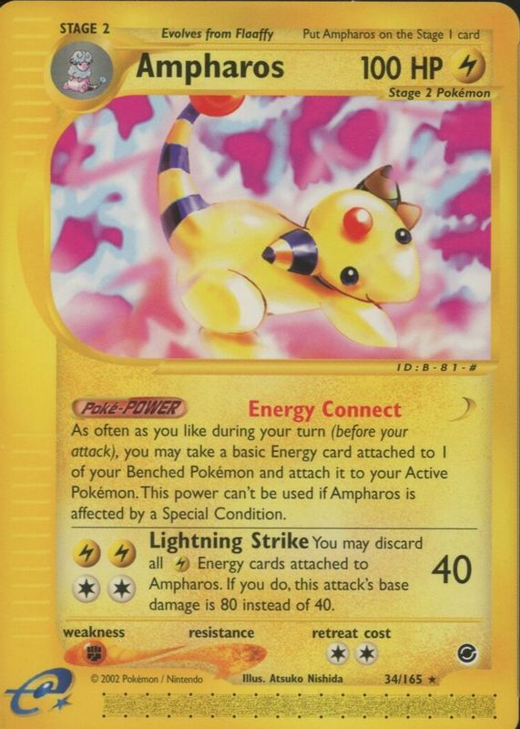 The Ampharos 2002 Expedition #034/165 Base card in Raw TCG (Near Mint) condition has moved up $5.00 (+50.0%) in the last 30 days and was last sold for $15.00 .