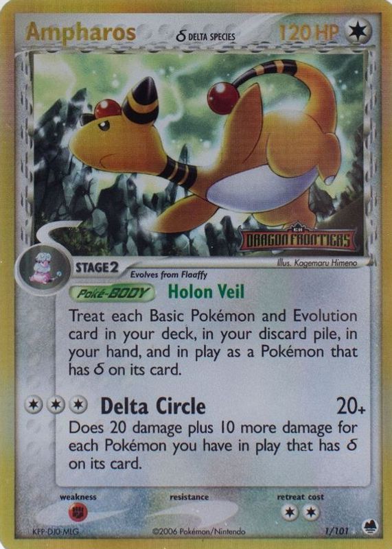 The Ampharos 2006 EX: Dragon Frontiers #001/101 Reverse Holo card in Raw TCG (Near Mint) condition has moved down -$63.99 (-80.0%) in the last 30 days and was last sold for $16.00 .