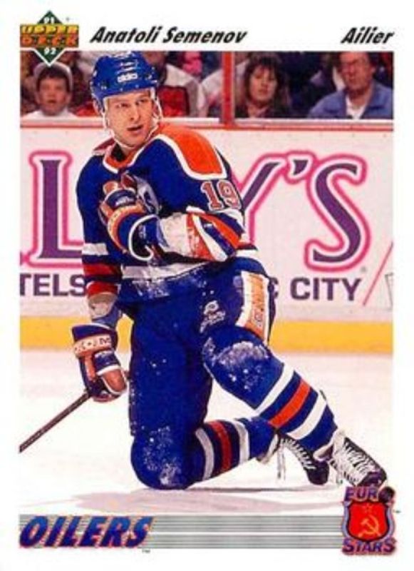 The Anatoli Semenov 1991 Upper Deck French #E4a Euro Stars card is 1 of 2 Anatoli Semenov's card variations in the 1991 Upper Deck French set being tracked by Sports Card Investor, including Euro Stars.