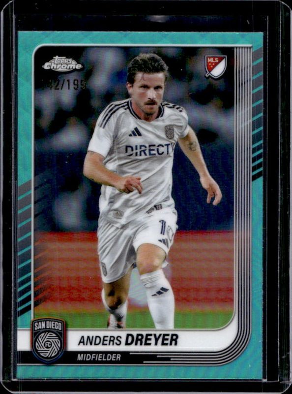 The Anders Dreyer 2025 Topps Chrome MLS #108 Aqua Refractor /199 card is 1 of 66 Anders Dreyer's card variations in the 2025 Topps Chrome MLS set being tracked by Sports Card Investor, including Base, Blue Lava Refractor, Frozenfractor, Mania Refractor, and Prism Refractor.