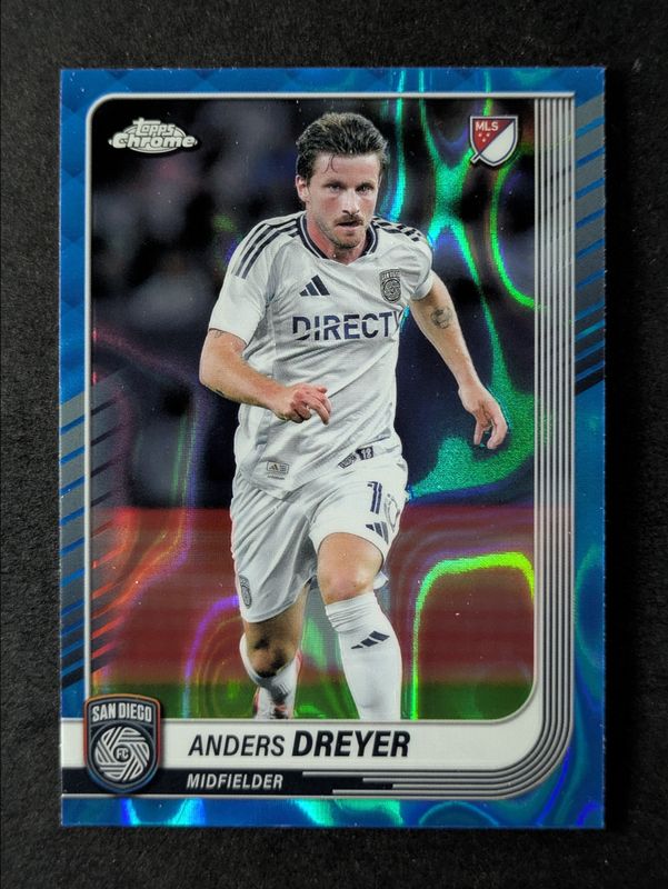 The Anders Dreyer 2025 Topps Chrome MLS #108 Blue Lava Refractor card is 1 of 66 Anders Dreyer's card variations in the 2025 Topps Chrome MLS set being tracked by Sports Card Investor, including Base, Frozenfractor, Mania Refractor, Prism Refractor, and RayWave Refractor.