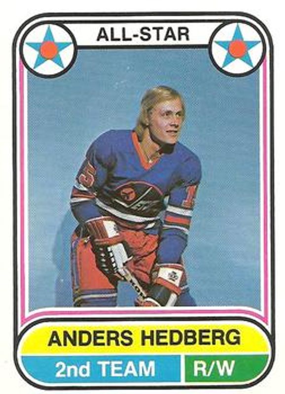 The Anders Hedberg 1975 O-Pee-Chee WHA #72 Base card is 1 of 2 Anders Hedberg's card variations in the 1975 O-Pee-Chee WHA set being tracked by Sports Card Investor, including Base.