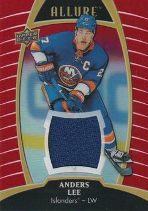 The Anders Lee 2019 Upper Deck Allure #29 Red Rainbow Jersey Relics card is 1 of 27 Anders Lee's card variations in the 2019 Upper Deck Allure set being tracked by Sports Card Investor, including Base, Pewter, Red Rainbow, White Rainbow, and Yellow Taxi.