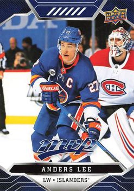 The Anders Lee 2019 Upper Deck MVP #116 Blue card is 1 of 12 Anders Lee's card variations in the 2019 Upper Deck MVP set being tracked by Sports Card Investor, including Base, Gold Script, Puzzle Backs, Silver Script, and Super Script /25.