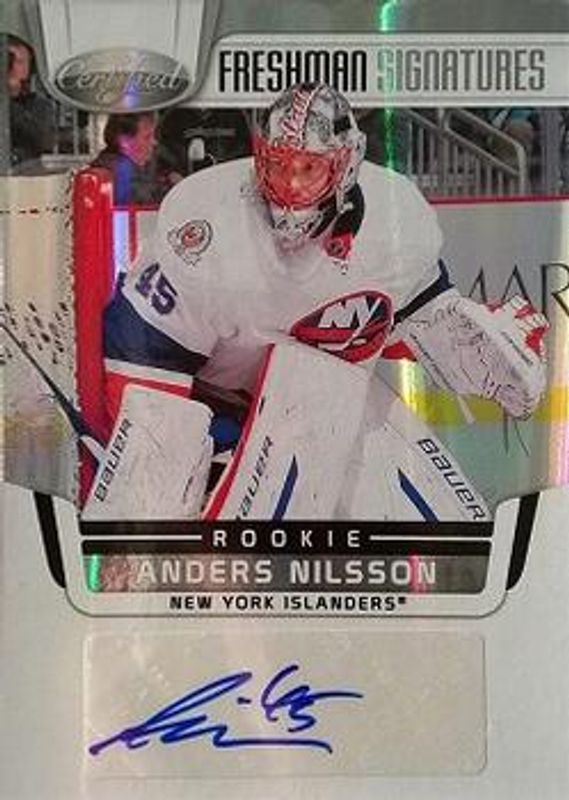 The Anders Nilsson 2011 Panini Rookie Anthology #227 2011 Panini Certified Update: Freshman Signatures card is 1 of 11 Anders Nilsson's card variations in the 2011 Panini Rookie Anthology set being tracked by Sports Card Investor, including Crown Royale Rookie Royalty Signatures, Pinnacle Ice Breakers, Pinnacle Ice Breakers Autographs, Limited Rookie Phenoms /299, and Limited Rookie Phenoms Silver /50.