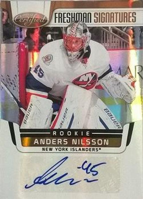The Anders Nilsson 2011 Panini Rookie Anthology #227 2011 Panini Certified Update: Freshman Signatures Mirror Gold /25 card is 1 of 11 Anders Nilsson's card variations in the 2011 Panini Rookie Anthology set being tracked by Sports Card Investor, including 2011 Panini Certified Update: Freshman Signatures, Crown Royale Rookie Royalty Signatures, Pinnacle Ice Breakers, Pinnacle Ice Breakers Autographs, and Limited Rookie Phenoms /299.