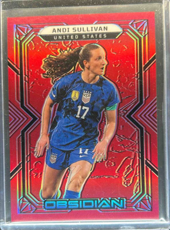 The Andi Sullivan 2022 Obsidian #124 Electric Etch Red Flood /10 card is 1 of 24 Andi Sullivan's card variations in the 2022 Obsidian set being tracked by Sports Card Investor, including Base /115, Electric Etch Orange /40, Electric Etch Red Pulsar /30, Electric Etch Purple Flood /25, and Electric Etch Blue /20.