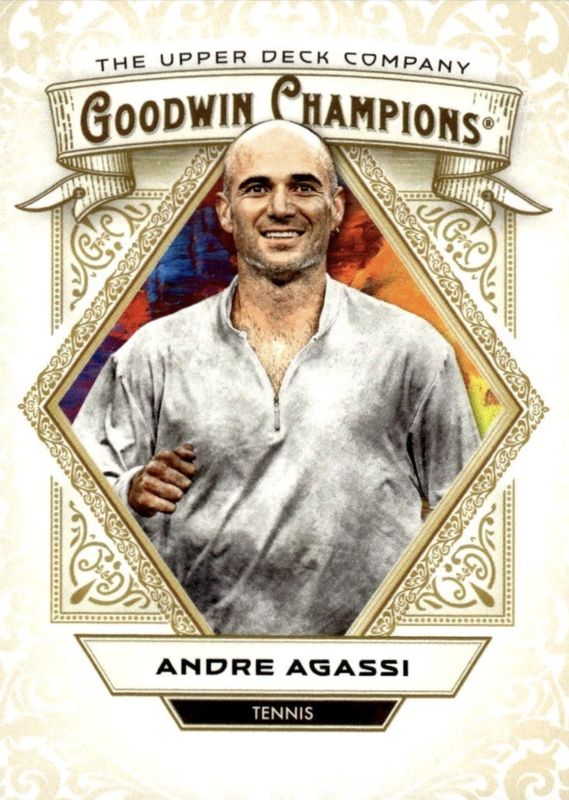 The Andre Agassi 2025 Upper Deck Goodwin Champions #8 Base card is 1 of 60 Andre Agassi's card variations in the 2025 Upper Deck Goodwin Champions set being tracked by Sports Card Investor, including Blank Backs, Glossy Black, Lucky Gold Rainbow, Lucky Red, and Neon Green Rainbow.