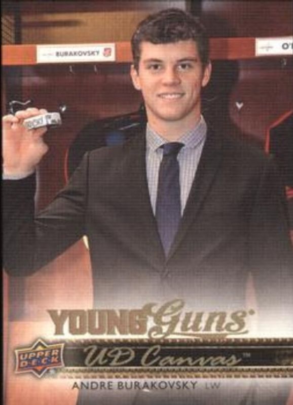 The Andre Burakovsky 2014 Upper Deck #C118 Young Guns Canvas Rookie card is 1 of 19 Andre Burakovsky's card variations in the 2014 Upper Deck set being tracked by Sports Card Investor, including Young Guns Base, Young Guns - Acetate, Young Guns - UD Exclusives /100, Young Guns - UD High Gloss /10, and Printing Plates Black /1.