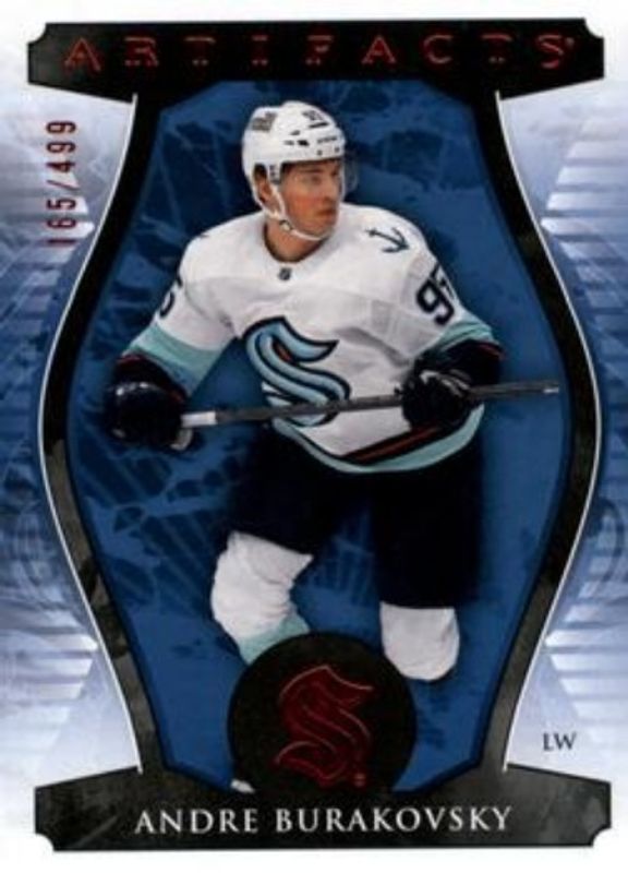 The Andre Burakovsky 2023 Upper Deck Artifacts #69 Ruby /499 card is 1 of 18 Andre Burakovsky's card variations in the 2023 Upper Deck Artifacts set being tracked by Sports Card Investor, including Base /999, Turquoise, Copper /299, Royal Blue /199, and Emerald /99.