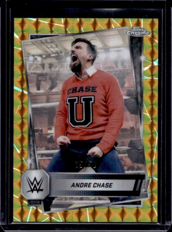 The Andre Chase 2025 Topps Chrome WWE #32 Gold Geometric Refractor /50 card is 1 of 50 Andre Chase's card variations in the 2025 Topps Chrome WWE set being tracked by Sports Card Investor, including Base, Black & Gold Refractor, Geometric Refractor, Neon Green & Black Refractor, and Pink Shimmer Refractor.