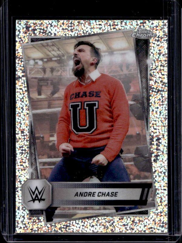 The Andre Chase 2025 Topps Chrome WWE #32 Speckle Refractor /249 card is 1 of 50 Andre Chase's card variations in the 2025 Topps Chrome WWE set being tracked by Sports Card Investor, including Base, Black & Gold Refractor, Geometric Refractor, Neon Green & Black Refractor, and Pink Shimmer Refractor.
