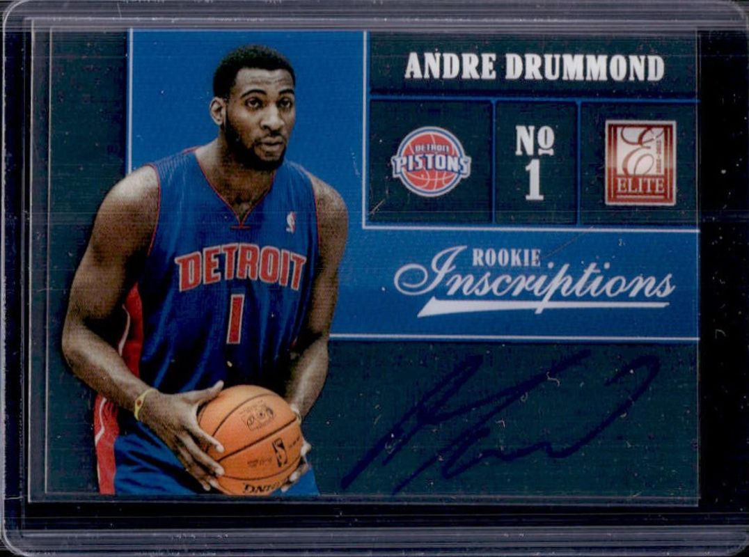 The Andre Drummond 2012 Elite #75 Rookie Inscriptions card is 1 of 7 Andre Drummond's card variations in the 2012 Elite set being tracked by Sports Card Investor, including Base Rookie /599, Aspirations Die-Cut, Status Red Die-Cut, Status Gold Die-Cut /24, and Status Black Die-Cut /1.