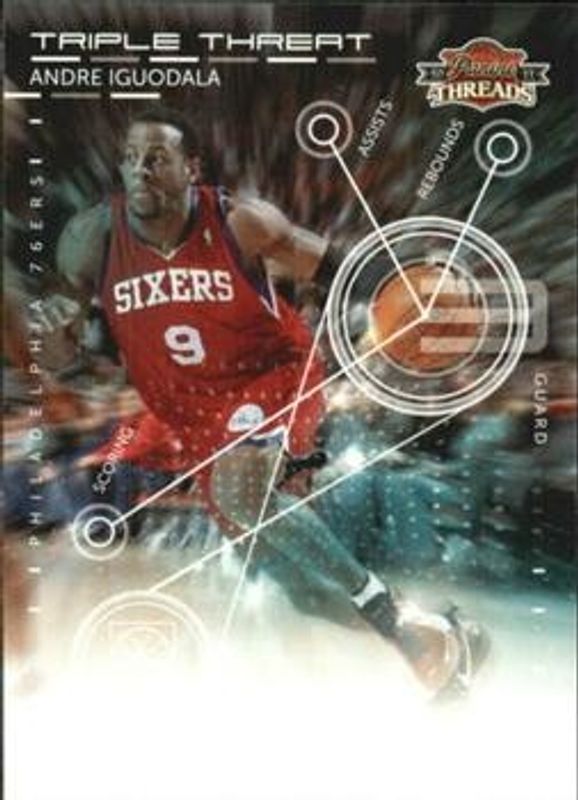 The Andre Iguodala 2010 Threads #3 Triple Threat card is 1 of 17 Andre Iguodala's card variations in the 2010 Threads set being tracked by Sports Card Investor, including Base /399, Century Proof Orange /199, Century Proof Silver /199, Century Proof Gold /99, and Century Proof Platinum /25.